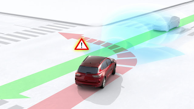 In the Ford Kuga (known around these parts as the Escape), this feature reads parallel lanes for cars approaching from up to 28 meters up to 20 times per second. It only intervenes if it detects a lane switch that will cause an accident. Intersection Assist, meanwhile, is a similar new feature that scans for oncoming vehicles on parallel lanes.